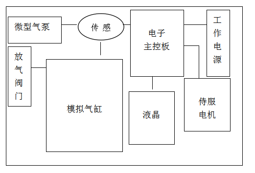 整个仪器由工作电源、微型气泵、模拟气缸、侍服电机、储气盒、压力传感器、电子主控板、放气阀门和触摸液晶构成。